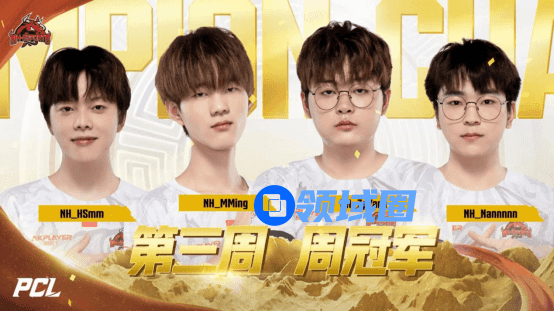 周决赛首日第三局六阶段,NH战队面对南部的混战,坐收渔翁之利,淘汰掉残编的DDT战队,随后的七阶段,NH战队在圈中心拉开枪线以合围之势淘汰KRG战队,拿到周决赛首鸡;第二日第五局八阶段,NH战队淘汰掉Tianba战队后进入决赛圈与DT战队SOLO。两支战队均是满编状态,但转瞬之间,NH战队展现默契配合以钳形攻势击倒DT战队三人,轻松拿下比赛。最终,NH战队以113分甩开第二名31分拿下本周周冠军!