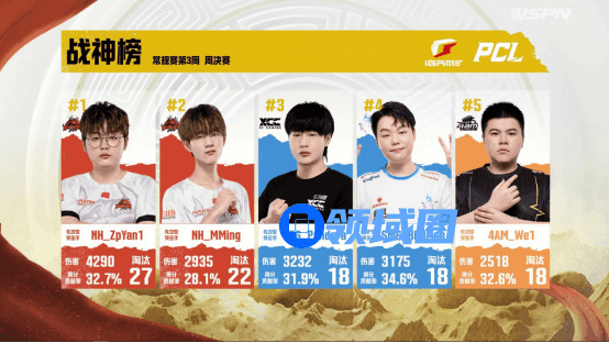 本周NH战队全员从开赛第一天就展现惊人的状态,并一直维持到周决赛:ZpYan1选手和MMing选手分别以4290、2935的惊人伤害值拿下一二名,特别是ZpYan1选手更是以27个淘汰数甩开其他选手获得本周战神的称号;XCG战队Pandora选手表现神勇,以18个淘汰数和3232的伤害值拿到战神榜第三;周亚军SMS战队功臣BBQFish选手则是以34.6%的得分贡献率位居第四;4AM战队的人气选手We1以2518的伤害值和18个淘汰数排在第五。