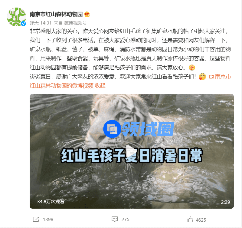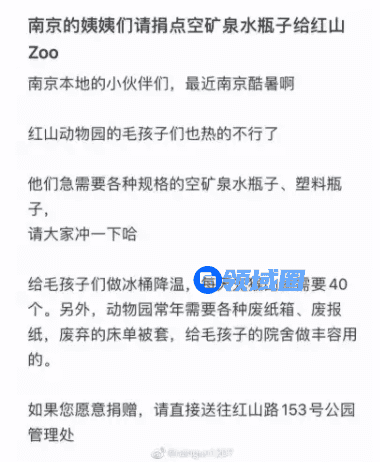 最近,有南京一网友为南京红山森林动物园的动物们发表了一则“求援公告”,这位网友表示:南京红山森林公园急需大量矿泉水瓶、塑料瓶,来为动物园里的动物们制作“冰桶”进行人工降温,此消息一出,迅速地引发了社会各界的广泛关注。