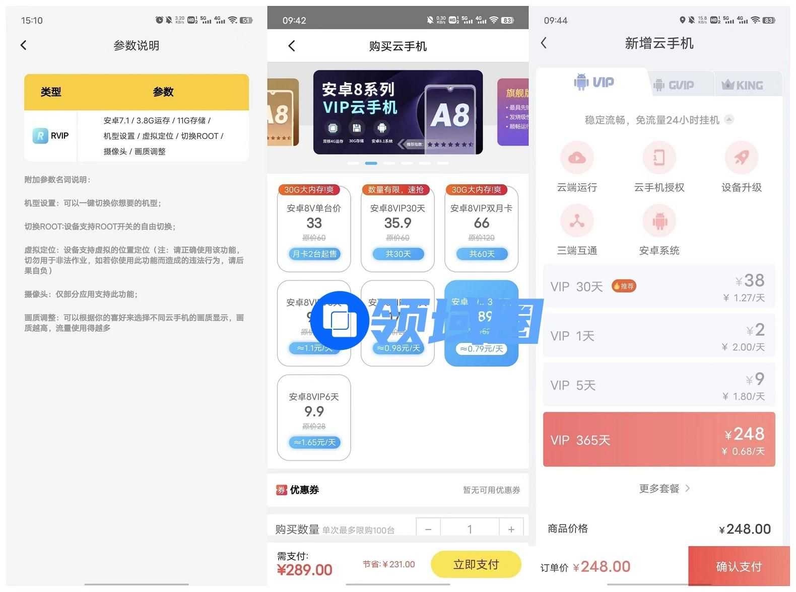 接下来,我们购买三者的VIP套餐,开始进行云手机的初步体验。在云手机的界面展示上,就有云手机的优势特别突出。