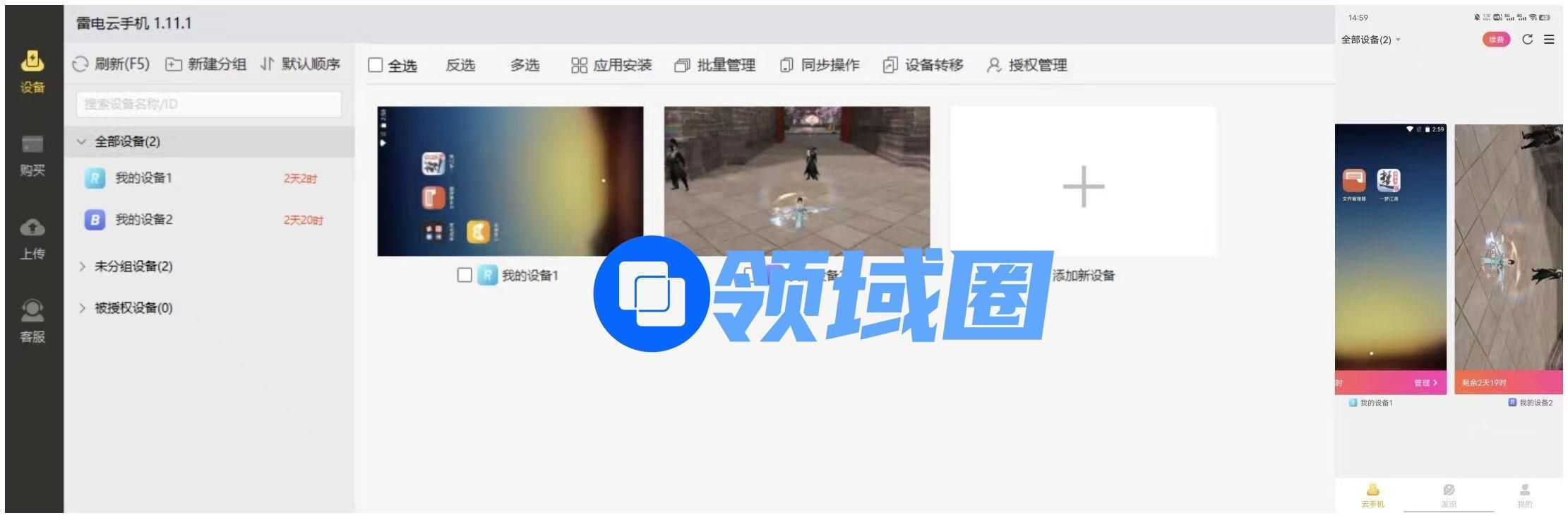 (以雷电云为例,左图为电脑界面,右图为手机界面,均为两台云手机同屏预览)