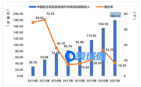 自2017年开始,中国厂商逐步加大对海外市场开拓力度。国产游戏出海收入从2017年的82.76亿美元,迅猛增长至2021年的180.31亿美元,年复合增速高达16.83%,远远快于国内市场。目前国内厂商在欧美、日韩等成熟市场上,也取得了大幅增长,站稳了脚跟。