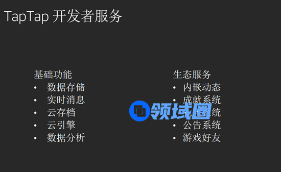TDS提供了包括云存档、数据分析、数据储存等基础功能,也提供了包括内嵌动态、成就系统、礼包系统等生态服务。