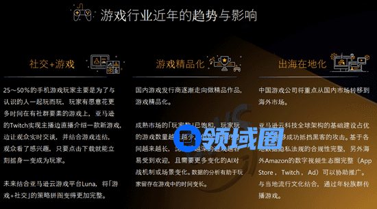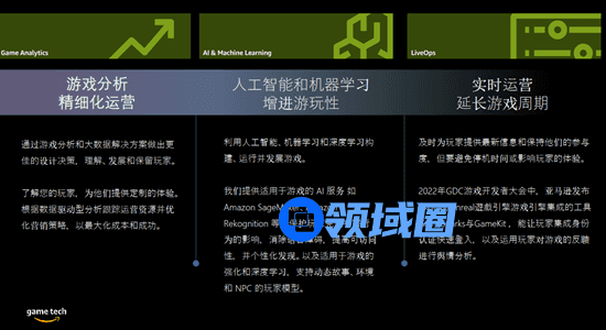 - 出海游戏走向精品化,数据的分析有助于玩家留存在游戏中的时间变长,亚马逊提供多样的数据分析工具;