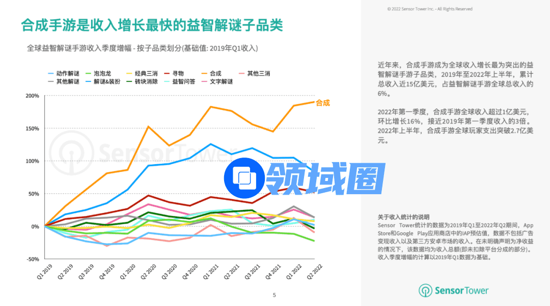 据Sensor Tower数据,2022年上半年,Merge(合成)手游玩家支出突破2.7亿美元,是近年下载量和收入增长最快的益智手游子品类。
