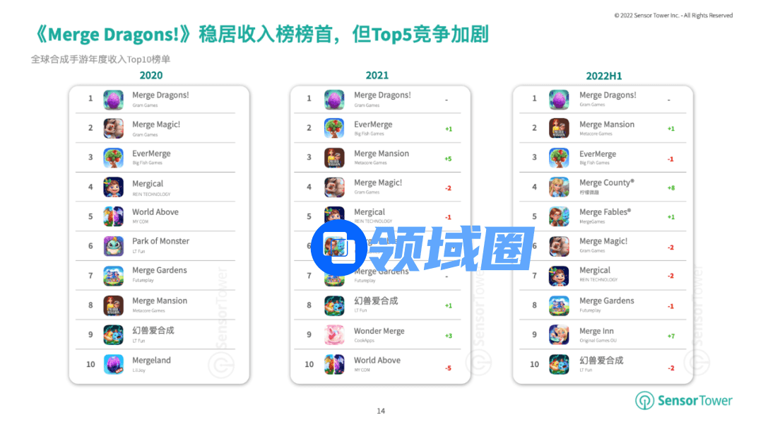 其中《Merge Dragons!》在竞争日趋激烈的Merge赛道中持续保持着超强竞争力,在2020年至2022年上半年期间,《Merge Dragons!》稳居收入榜榜首,而二合+经营玩法的《Merge Mansion》在这期间的收入则出现大幅上升,从2020的第8名上升到了2022年上半年的第2名。