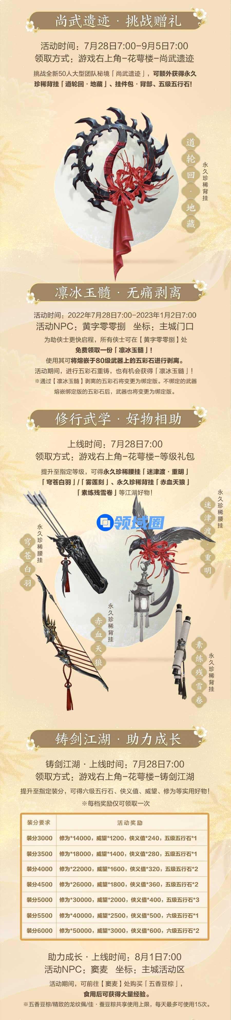 月度签到今日开启,配套雅致繁花腰背挂件【紫茸清歌】、【芸阁紫雪】及挂件包参与即得;铸剑江湖、尚武遗迹等赠礼缤纷上线,珍稀挂件海量实用道具惊喜掉落;十重福利活动今日降临,共贺赛季迎新!详情见下图。