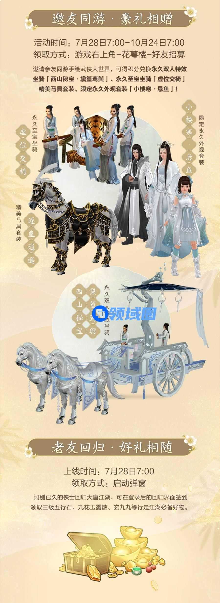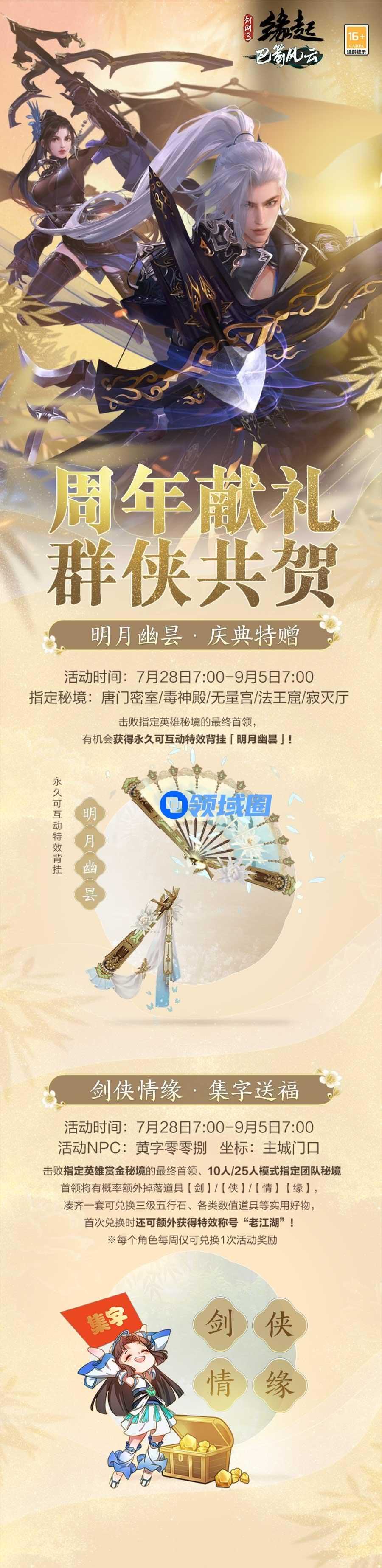 周年活动好礼加码,挑战指定赏金秘境拿周年特效背挂【明月幽昙】,周年集字更送特效称号“老江湖”还可兑换更多游戏实用道具。