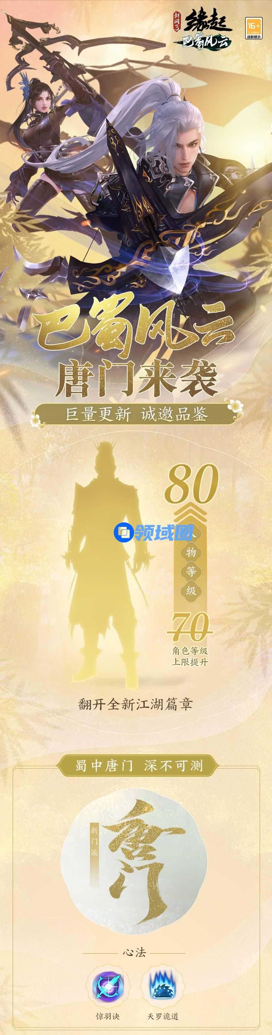 巴山蜀地现风波,竹叶清翠衔新来。在“巴蜀风云”全新赛季中,侠士的等级上限将首次提升,共同前往巴蜀地区开启80级黄金篇章;蜀中唐门奕奕登场,擅长机关诡道的刺客世家今日亦开始广招门徒;50人大型竞技团队秘境【尚武遗迹】顶级秘宝惊喜掉落;更多手绘画质升级新场景、玩法革新新日常尽在“巴蜀风云”。