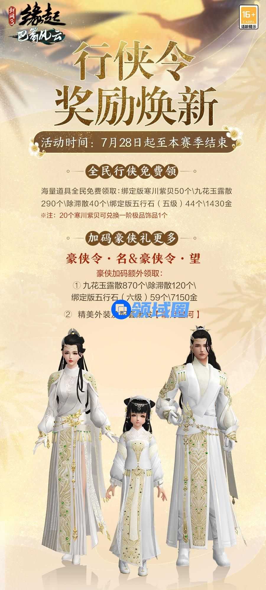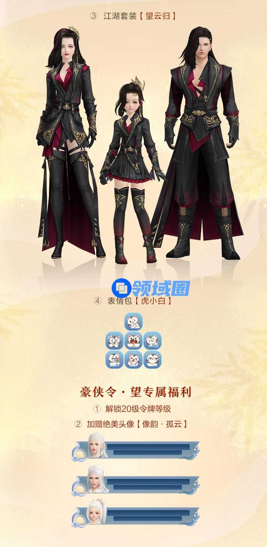 行侠江湖精品助力。行侠令今日奖励上新,海量实用道具及顶级首饰打造材料【紫川寒贝】免费可领,升级“豪侠令”后更有华丽外装【霜月星河】、飒爽江湖劲装【望云归】、绝美白发头像【像韵·孤云】、表情包【虎小白】待侠士解锁!更有两款超值礼盒【逍遥厚学盒】【逍遥开悟箱】惊喜上架,助力侠士开启赛季新征程!