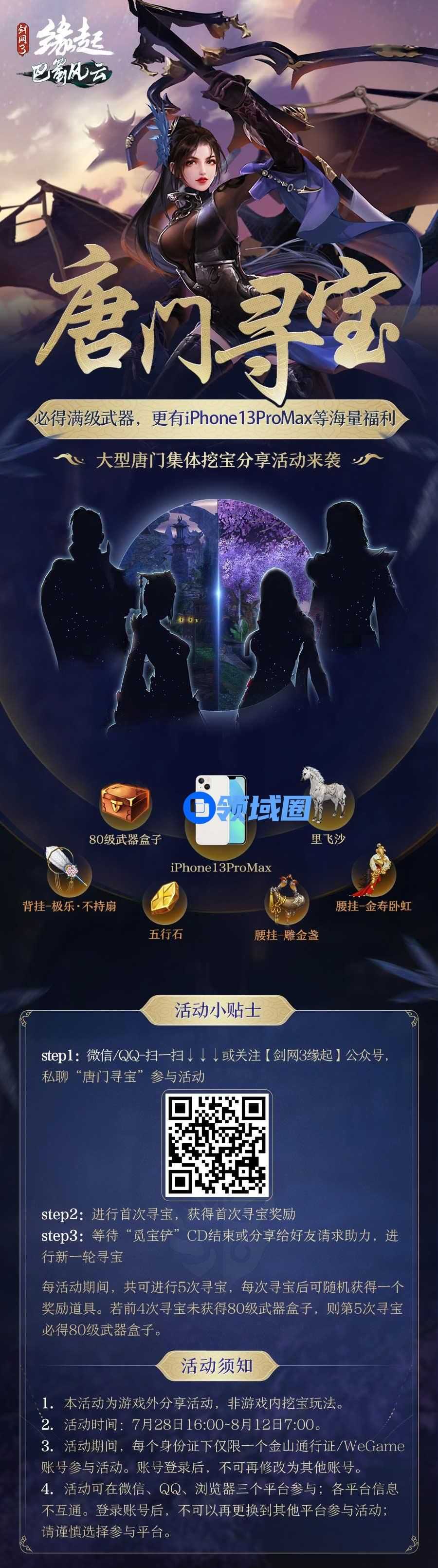 唐门寻宝觅大礼。大型唐门集体挖宝活动【唐门寻宝】今日同步开启!7月28日16:00-8月12日7:00,侠士可扫描图中二维码参与活动,即有机会获得永久精美挂件三个、限时里飞沙、iPhone13 Pro Max等海量实用好礼!寻宝5次更有80级武器盒子100%掉落!