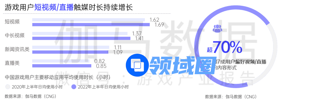 随着各类互联网内容平台快速崛起,抖音、今日头条、Bilibili、虎牙直播等都成为了游戏用户日常获取游戏信息的媒体途径,短视频与直播的内容形态更受到用户欢迎,不仅用户规模持续提升,平均使用时长也在稳定上涨。