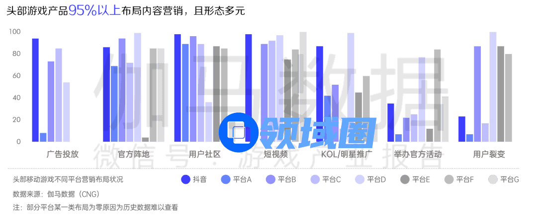 伽马数据显示,头部的Top100移动游戏产品目前在各种平台的投入情况,95%以上的游戏产品已经在布局内容相关营销,内容形态也呈现丰富趋势,包括短视频、话题、明星和KOL推广等等,其中布局短视频的游戏产品达到98%。