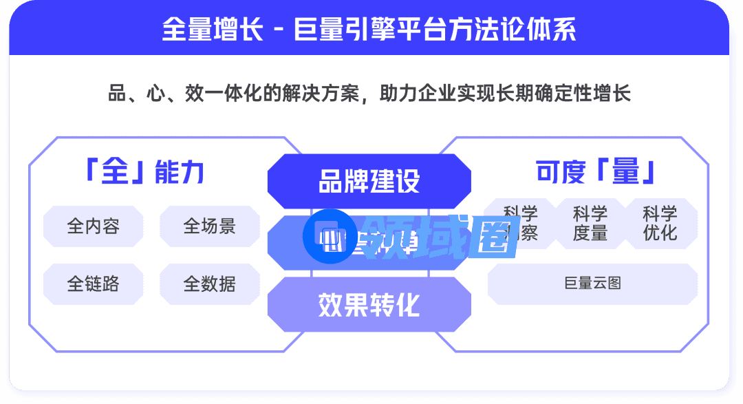 巨量引擎作为内容型平台,客户感知最深的优势在于“规模化”——规模化的用户和规模化的内容;今年,巨量引擎依托规模化内容平台的优势,升级了营销价值体系— “全量增长”,围绕“全能力”和“可度量”两大独核心优势,从「品牌建设」、「心智种草」、「效果转化」三个层面帮助企业实现营销和经营一体化,同时提供科学的策略指导及价值度量,从根本上帮助企业主实现确定性的生意增长。