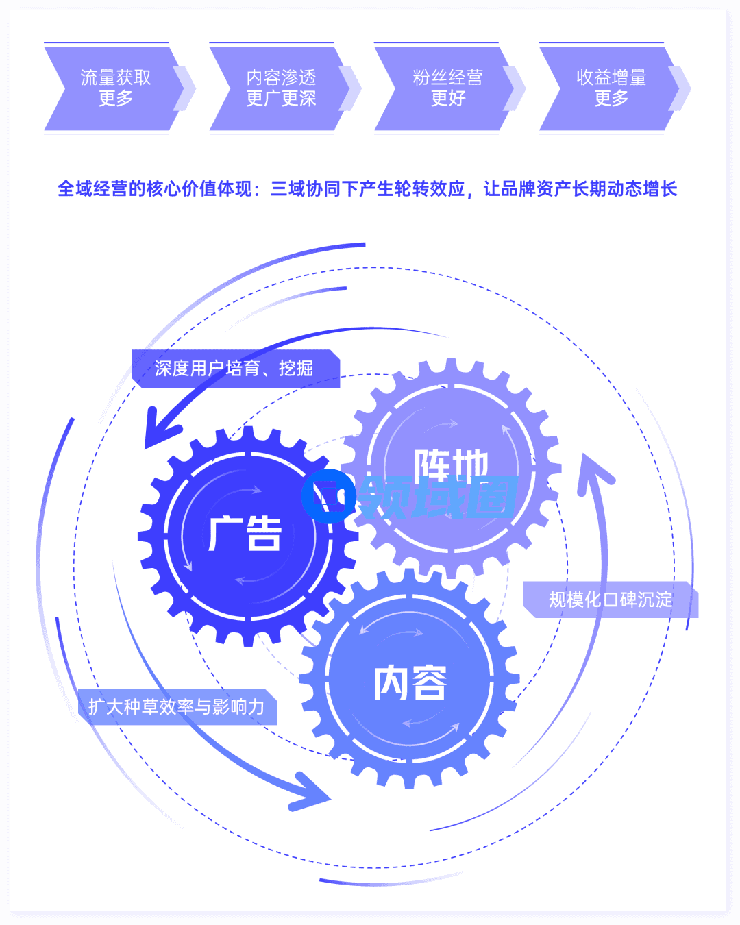 运营精细化:全域经营强调用户终身价值的维系、并运用内容营销、阵地经营等多元的方式持续帮助产品补充用户,优化产品用户生态,强化长期黏性。