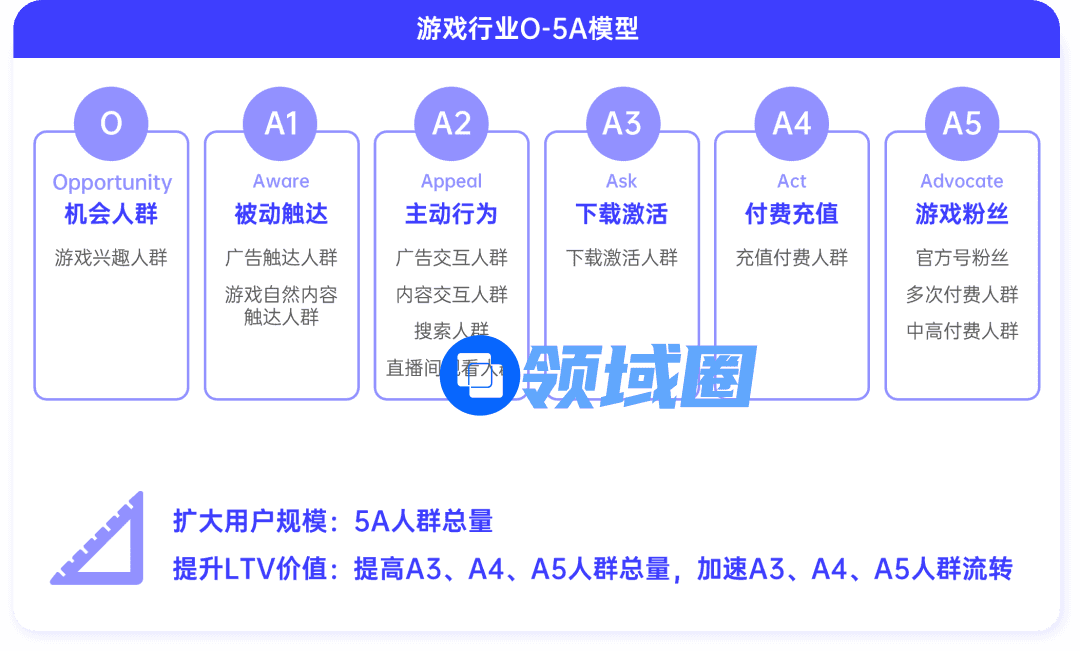 一个游戏爱好者,在为一款游戏付费前,通常会经历这样的心路历程:“一无所知 → 有点印象 → 产生好奇 → 兴趣渐浓 → 下载付费”。每个投放周期,大量不同阶段的用户并存,需要广告主分别匹配不同营销方式。因此,游戏行业5A重新定义了企业和用户之间由浅到深的关系,构建分层递进式完整链路。