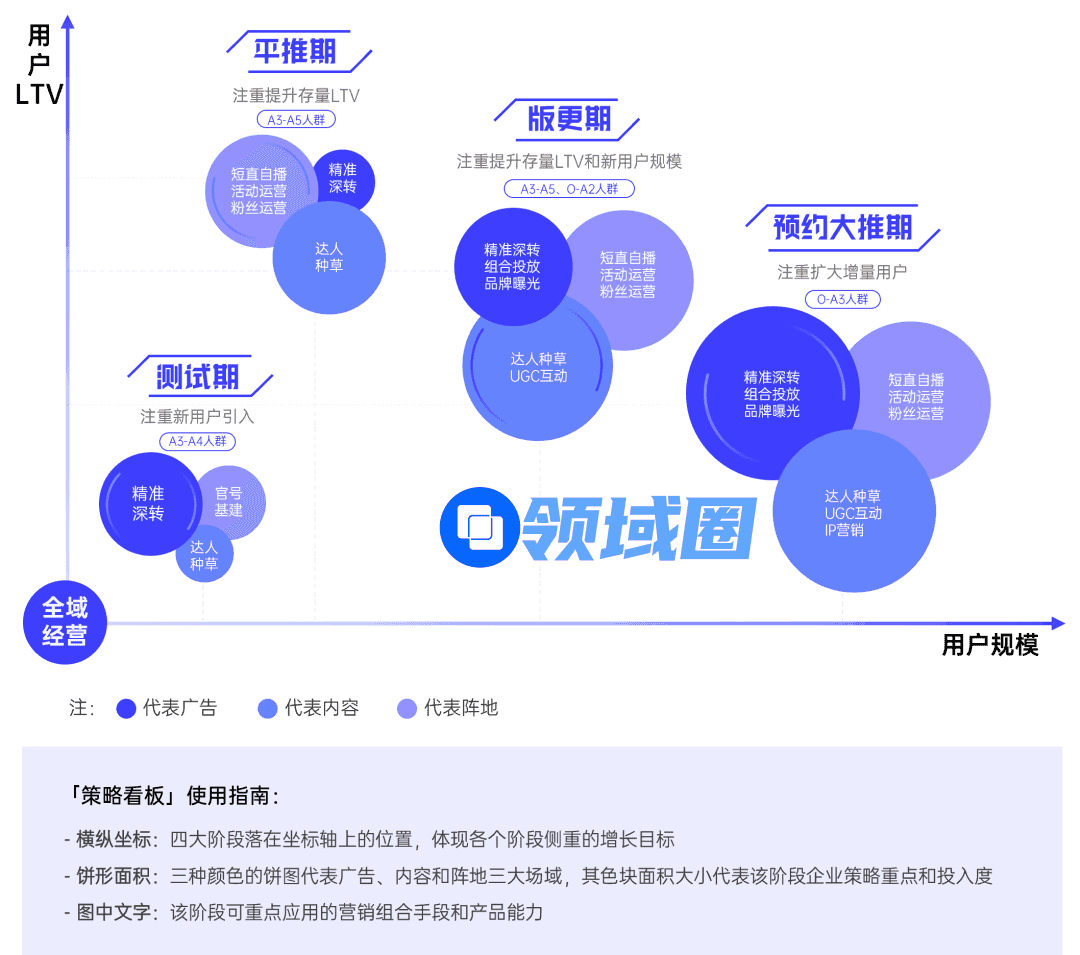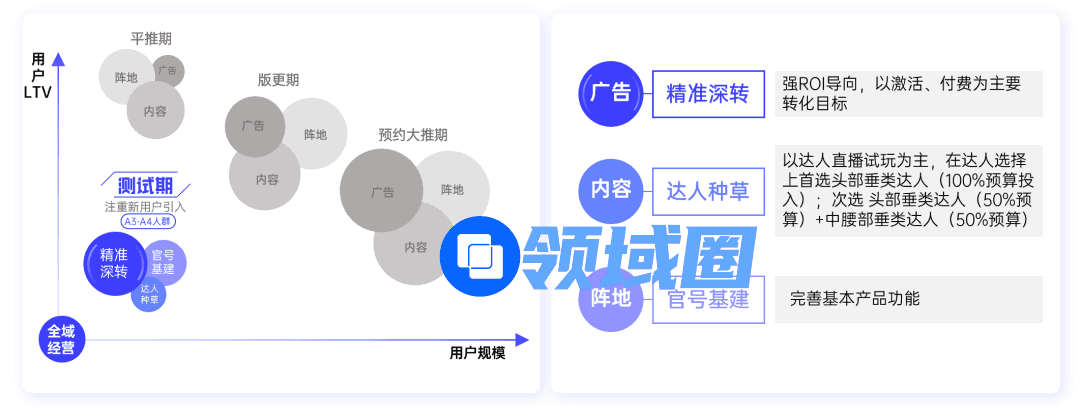 围绕用户规模与LTV两个目标,聚焦游戏企业持续经营的三个场域:广告、内容、阵地,针对测试期、预约大推期、平推期、版更期四大阶段,组合运用好九大手段。最终实现找准游戏的潜在用户、做好全生态的内容,以及在持续沟通用户的过程中,引导用户产生更多与游戏相关的深度习惯(下载、看直播、付费充值),激发用户长期价值。