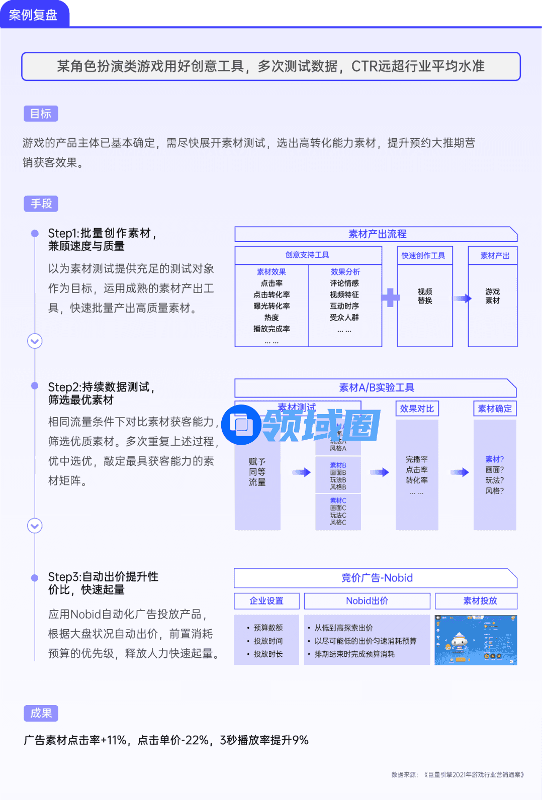 从游戏行业的趋势洞察到营销场景应用,再到商业产品的组合合作方案,都提供了全方位的策略建议与实操指导:- 「测试—预约大推—平推—版更」四大阶段营销解决方案