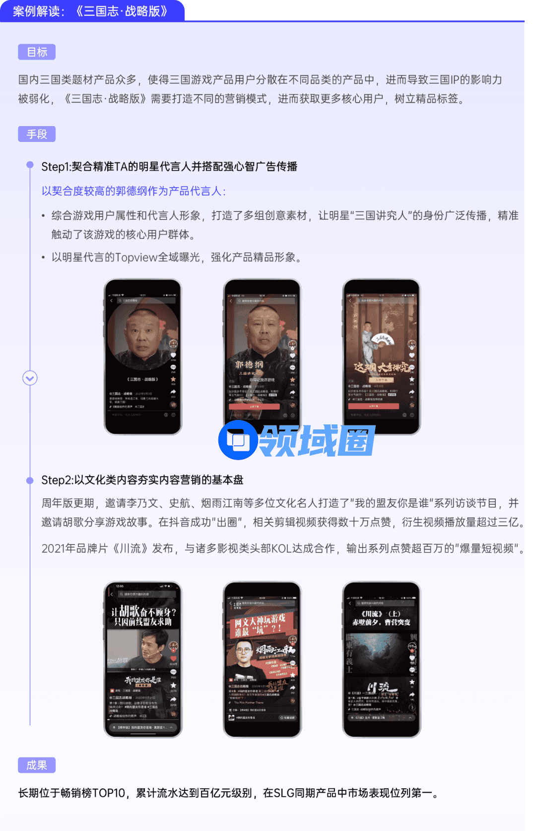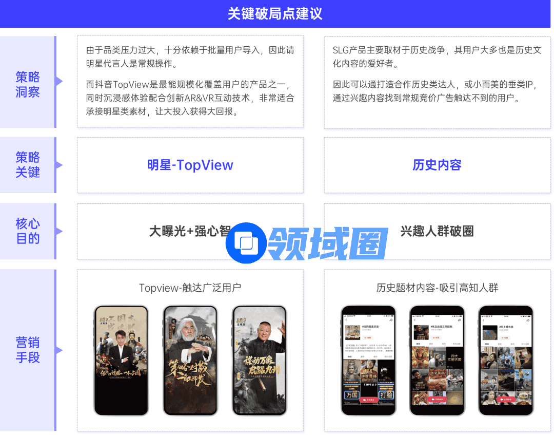 明星有助于SLG产品提升曝光度。选取粉丝群体与游戏用户重叠度高的明星,配合强曝光、沉浸感的广告产品,更有助于打动用户;围绕历史题材展开内容营销也将吸引更多核心高知人群聚集。