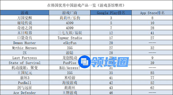 在本期榜单上,《荒野行动》与《万国觉醒》分别是出海日本、韩国市场游戏中在当地畅销榜上排名最靠前的。