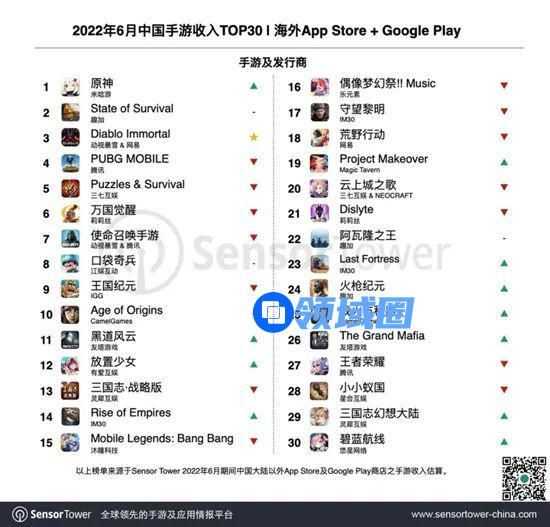 虽然未列入表内,但网易与暴雪合作的《暗黑破坏神:不朽》自海外上线后表现一直不错,登顶美、英、德以及日韩市场免费榜。上线首月,Sensor Tower估算游戏流水超过5400万美元。由于一些原因,《暗黑破坏神:不朽》国内上线计划延期。