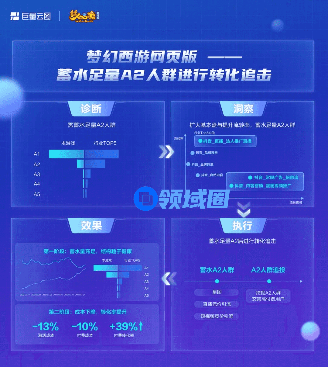 双管齐下,该游戏A2用户量级迅速攀升67%,整体5A结构趋于健康,游戏激活成本与付费成本均有超过10%的下降,付费转化率提升了近四成;且A3和A4的转化有50%以上来自A2。从最终效果来看,该游戏通过A2蓄水转化实现了用户经营的降本增效。