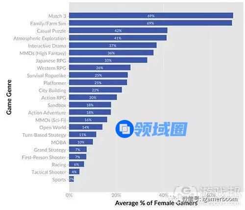 不同类型游戏的女性玩家平均数量是在2%至70%之间。