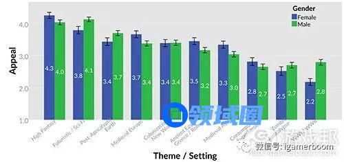 最不吸引人的主题则是现代超级英雄,僵尸启示录与一战/二战(游戏邦注:关于一战/二战男女间也存在很大的差异)。