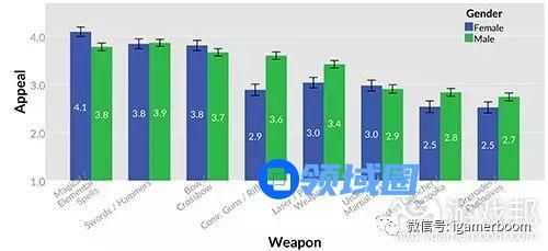 从总体上看来,男性玩家希望武器选择更加多样化。除了魔法咒语外,男性玩家关于武器选择的排名都是高于或和女性玩家相同。