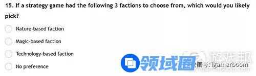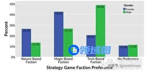 不管是严肃奇幻vs科幻题材还是咒语/宝剑vs枪支都能反应出不同性别对于游戏技术元素的不同看法。这让我们想到在早前关于1082个玩家所进行的调查研究时的一个问题,在那次的调查中我们让玩家从假想策略游戏的3个派别中选择1个。