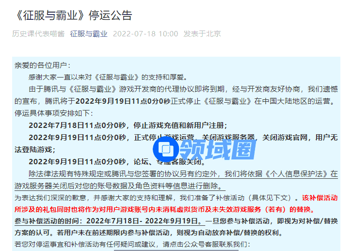近日,由腾讯代理发行的SLG手游《征服与霸业》突然发布停运公告,表示“由于腾讯与《征服与霸业》游戏开发商的代理协议即将到期,经与开发商友好协商,我们遗憾的宣布,腾讯将于2022年9月19日11点0分0秒正式停止《征服与霸业》在中国大陆地区的运营。”