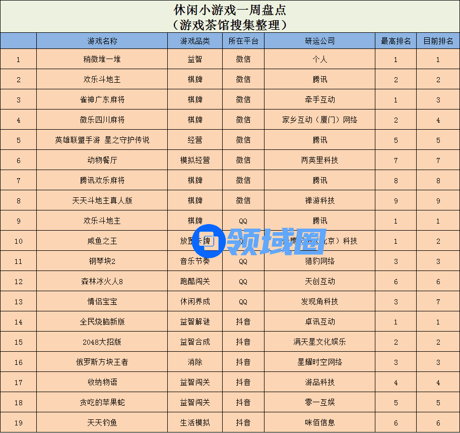 本周休闲游戏方面,在微信小游戏的综合榜单中,本周棋牌类游戏依然战局榜单前列大多数席位,其中由个人开发者打造的益智类游戏《稍微堆一堆》空降榜首,腾讯的《欢乐斗地主》和牵手互动的《雀神广东麻将》分别位于榜单第2和第3名。