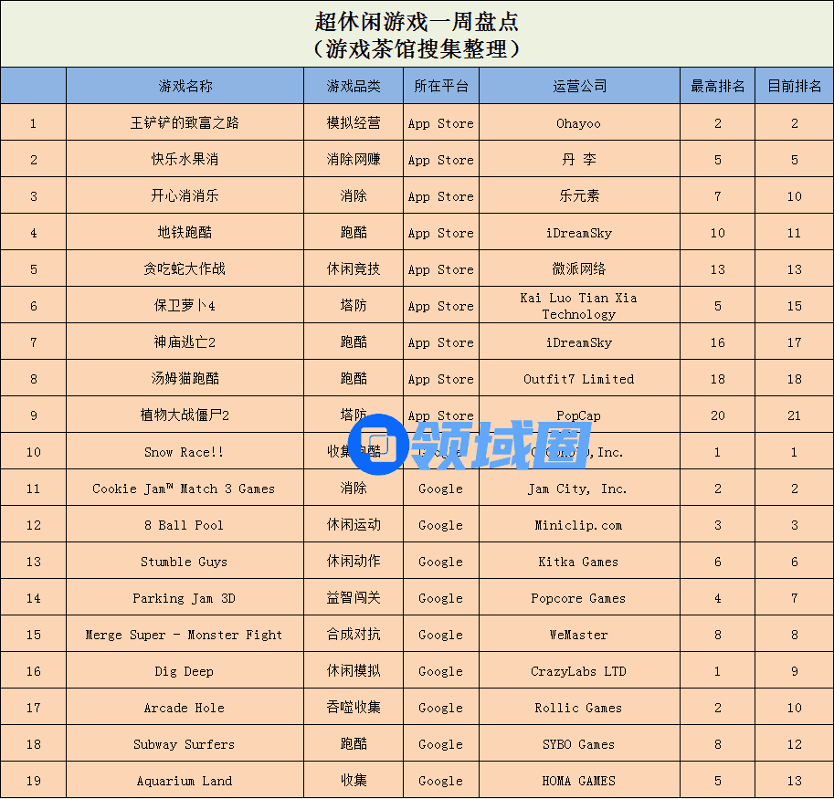 超休闲游戏方面,在App Store免费游戏榜单中,Ohayoo的怀旧题材的模拟经营游戏《王铲铲的致富之路》稳占超休闲榜首;Google Play免费游戏榜单中,收集跑酷游戏《Snow Race!!》空降榜首。