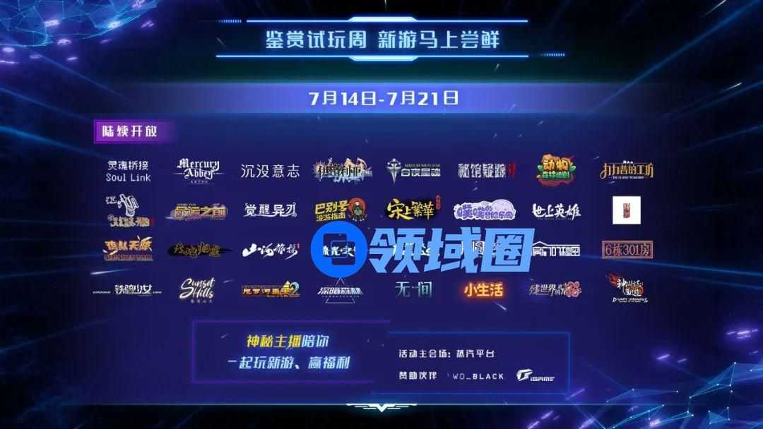 蒸汽平台首个鉴赏试玩周也将于7月14日19:00与蒸汽平台鉴赏家大会同步开启,为期7天的活动中玩家可免费试玩亮相游戏发布会的部分新游。鉴赏试玩周期间,蒸汽平台特邀神秘主播带领玩家直播游玩,品鉴鉴赏家们关注的好游佳作,届时千万不要错过哦!