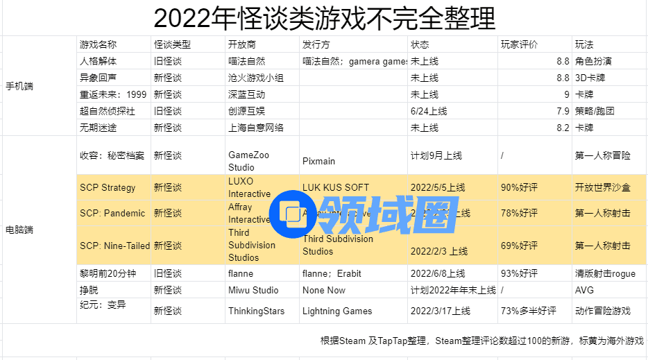 怪谈类似乎能跟任何玩法类型组合,也在手游及端游领域带来新鲜感,而这也成为新游戏话题度和销量提供可能的增长点。克苏鲁小说及基金会档案的素材浩瀚殷实,也能提供参考。