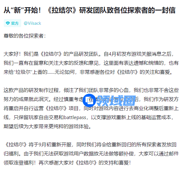近日,《拉结尔》官方突然发布公告,经过慎重考虑之后,将重启并自运营《拉结尔》项目,同时对游戏内容进行去商业化调整后重新上线,只保留玩家自由交易和通行证,以支撑游戏重新上线的基础运营成本,期待后续带给玩家更纯粹的游戏体验。