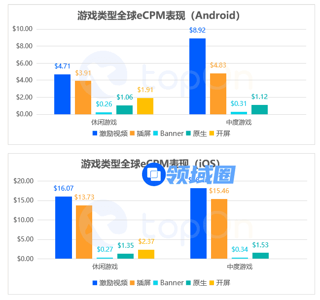 整体表现上,除激励视频外,各游戏类型的各广告样式eCPM相较2021年的变动≤$1。Android端的休闲游戏激励视频eCPM小幅下跌,而中度游戏则表现变好,激励视频小幅上涨。休闲游戏插屏上涨$0.7,中度游戏插屏下跌$0.3。iOS的休闲游戏和中度游戏激励视频的eCPM均上涨较为明显,主要原因是T1地区的用户量级增长。