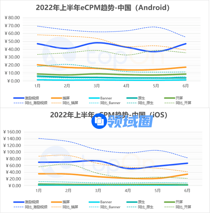 2022上半年,受限于版号、疫情等相关因素,国内手游广告变现收益整体下跌。新品无法如期上线,用户方面,据伽马数据统计,2022年3月和4月,国内游戏用户规模同比出现了下降,并达到了近一年来的最低水平。加之疫情反复,国内广告主预算缩减,多部门的合规整改影响仍在持续,导致整体获益表现不佳。但随着环境向好,5、6月的激励视频和插屏广告的eCPM走势较4月已开始回升。