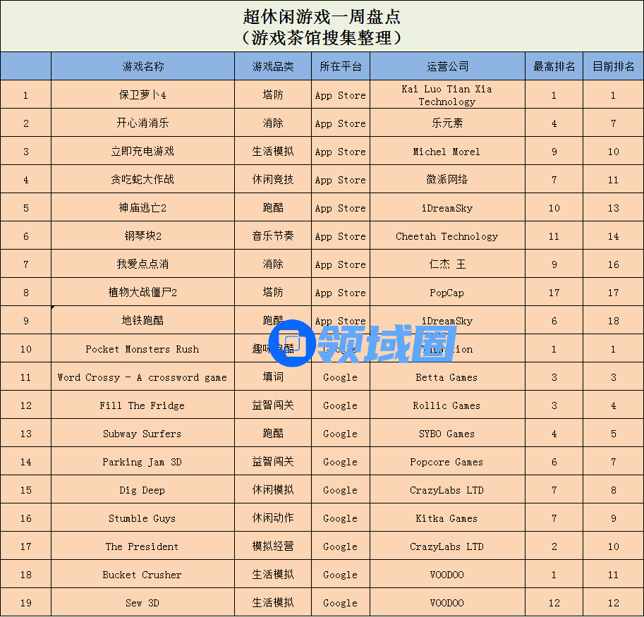 超休闲游戏方面,在App Store免费游戏榜单中,本周上线的塔防游戏《保卫萝卜4》空降榜首;Google Play免费游戏榜单中,TapNation发行的《Pocket Monsters Rush》稳占榜单第一的席位。