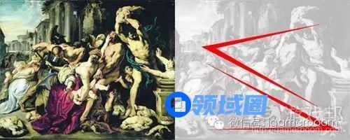 与Vermeer的作品相反的是Rubens的《Massacre of the Innocents》(见下图)。画家没有使用微妙的曲线构成,而是借用三角形结构传达暴力主题。Rubens巧妙地将大多数男性人物放在三角形上部,践踏着三角形下部的女性角色。然而,线条本身体现的是力量的冲突。