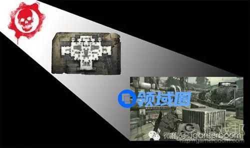 将经典的设计概念融入交互体验中,游戏《战争机器》是一个绝佳的范例。在图的左上角是《战争机器》的标志,就像所有设计良好的标志,它通过切题的视觉语言体现了游戏的体验。Epic公司的美工将头骨图案投射到关卡设计中(注意多人地图中的抽象的眼眶、鼻子和嘴巴)。