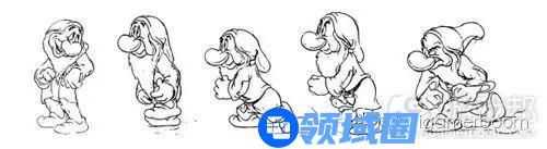 上图选由Frank Thomas和Ollie Johnston编写的必读书籍《The Illusion of Life: Disney Animation》(Disney Editions 1995)。在图中,小矮人Grumpy刚刚得到白雪公主的一个吻。注意,从右到左,他的侵略性较强的动作渐渐变得温和了,因为他气消了。