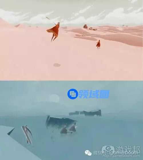 《Journey》的开头关卡没有明确的路径。如果你能把角色想象成一个铅笔尖或笔刷头,那么,我们就可以运用“开放画布”这个概念来分析这个关卡。设计师允许玩家在这个环境中随心所欲地画他们的路线。