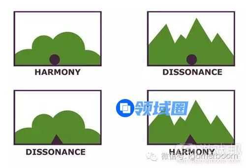 上图表示角色(紫色)及其所处的环境(绿色)。圆形角色处在圆形场景中(左上)表现了一种和谐的氛围,因为角色形状与环境形状相呼应。这种呼应使我们产生如家般的感觉——暗示了这里是角色的归属地。如果角色和环境都是方形或三角形(右下),我们也会觉得和谐,虽然基本形状的改变给我们带来的是不同的审美感受。