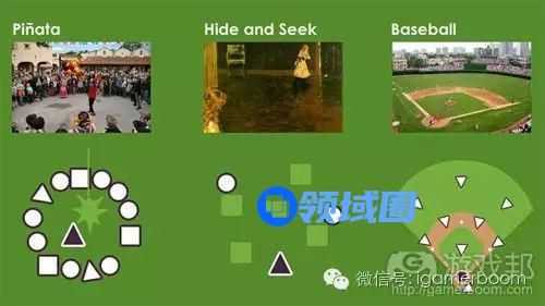 上图是三个游戏的示意图:敲彩罐(游戏邦注:piñata,墨西哥人过圣诞节或生日将玩具、糖果等礼物盛在此种罐内,悬于天花板上,由蒙住眼的儿童用棒击破)、捉迷藏和棒球。各个游戏中的主要玩家用紫色的图形。游戏的规则限定了游戏区域的形状,以及参与者的分布。我们已经知道,形状——圆形、方形和三角形会对我们(观者)产生强烈的心理学效应,所以我们有必要研究一下游戏的形状如何在情绪水平上影响玩家。