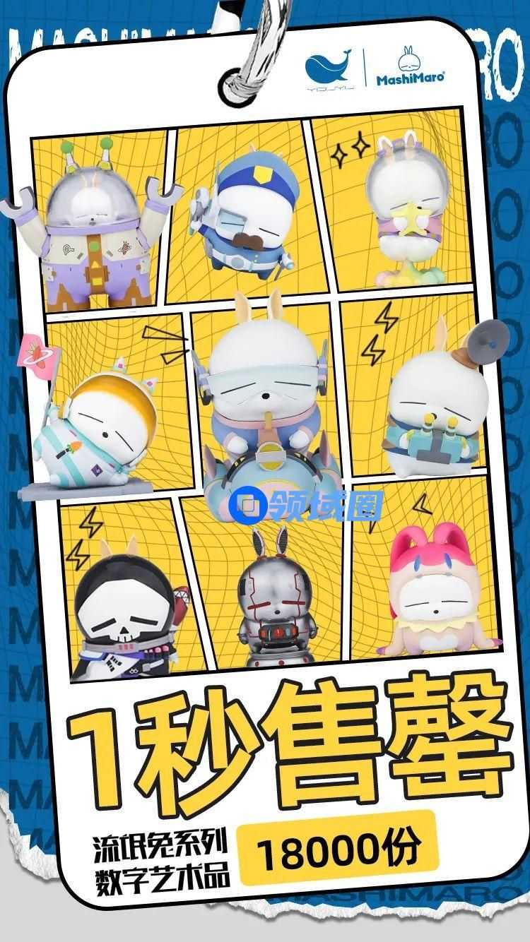 据了解,此次发售的流氓兔太空系列数字艺术品由“有鱼艺术”与江苏糖心文化传媒有限公司联合推出,发售上线9款超经典角色盲盒,每款发售2000份,合计18000份。用户成功购买流氓兔太空系列盲盒后,待26日晚18:30分可从盲盒中抽选9款经典角色中的任意一款。
