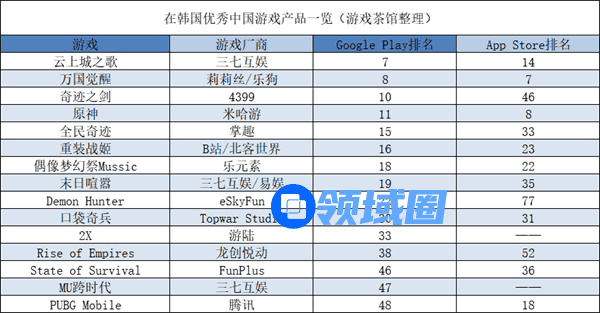 在本期榜单上,《原神》与《云上城之歌》分别是出海日本与韩国,在当地畅销榜上排名最高的游戏。