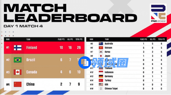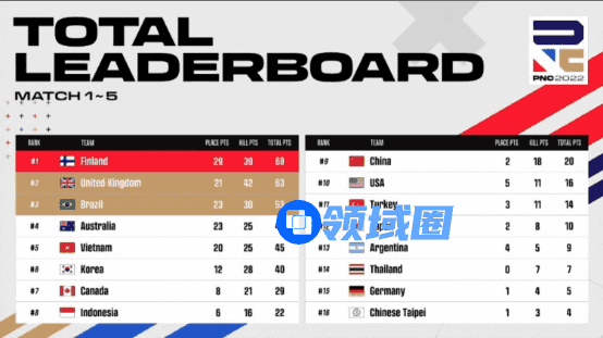 第五局比赛,地图为米拉玛。四阶段,中国大陆队淘汰掉英国队后仅存两人,还没来得及庆祝就在进圈路上被一颗手雷淘汰出局。决赛圈,芬兰队先手淘汰掉加拿大队,同时越南队淘汰掉澳大利亚队后与芬兰队决战,最终芬兰队拿下越南队再吃一鸡。本日积分榜如下: