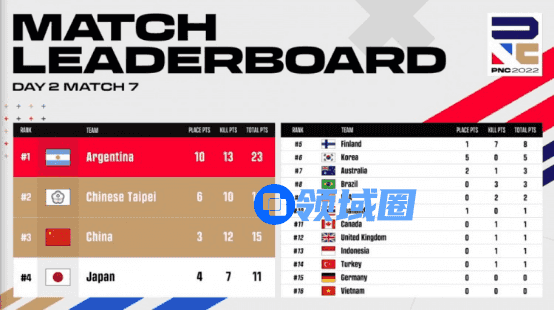 首局比赛,地图为米拉玛。中国大陆队四阶段进圈途中被韩国队淘汰二人;五阶段,混战中中国大陆队插手巴西队和越南队的交火,拿到两分后被越南队淘汰出局;决赛圈,英国队被毒圈淘汰,此时场上剩下韩国队和阿根廷队,双方僵持到最后阶段收圈时,阿根廷队依靠手雷优势压制韩国队,成功满编吃鸡!