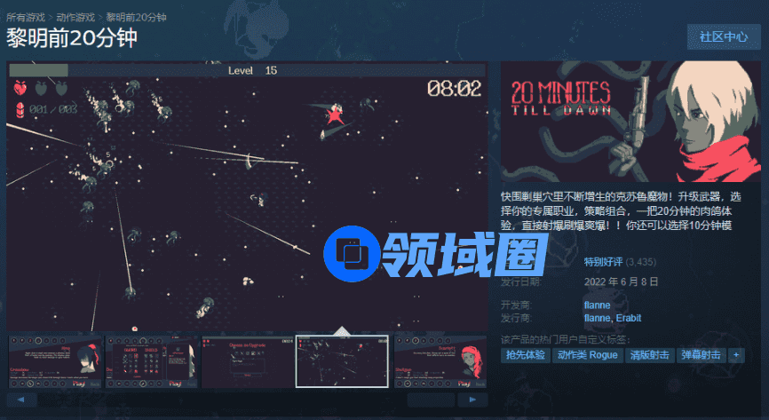 就在上周,一款风格化明显的独立游戏《黎明前20分钟》一经发售就获得的玩家一致好评。以红黑为主的画面配色让人一眼印象深刻,极简风格的生存玩法融合了清版射击,技能组合以及类Rogue随机元素,让这款“类吸血鬼”独游瞬间脱颖而出,在Steam不仅获得了开局96%的好评,这款游戏上线首日就已经突破了10万的销量,妥妥的独游爆款。
